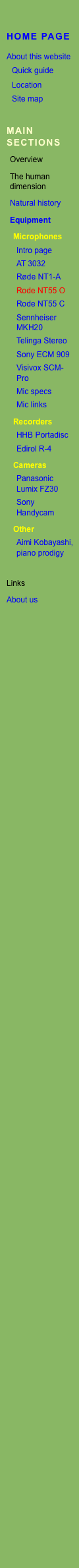 This is Corinne's response on hearing another piece and AB comparison from the same session: "Interesting. The Neumann sounds more trebly (tinny on the high notes) but picks up a lot more character on the low notes. The Røde makes the high notes sound rounder (less tinny), but doesn't pick up the low notes so well and makes the overall sound less immediate and slightly muffled (brings out the cupboard feel). I like what it does with the high notes (will be good for birds!), but I'd prefer to stick to the Neumann for my voice. Just shows that there isn't a microphone out there that's equally good on high and low." Next day she added, after hearing more samples: "Funny, I hear less difference today than I did yesterday. But I still think the Neumann gets more colours in the spectrum, but at the colder end (lots of blues and greens). The Røde is a warmer rosy colour, but more monochrome." Shows how difficult it can be to judge microphones. One can only really do it after a lot of experience with one. For another very interesting comparison of an omni mic with the Neumann, listen to the AB clips on the AudioTechnica 3032 page. | ||||||||||||||