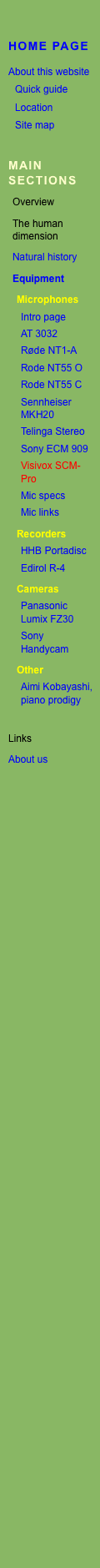 Many would find these quite acceptable. At the bottom of this page, Scrapbook page 5, you can compare the last clip with a recording of the same female tawny made with a really good mic, the Rode NT1-A. Both recordings were made from the same window with the owl probably in the same tree, though two years apart! I no longer use the SCM-Pro as a primary recording mic as my ambitions outstripped its capabilities. I found the intrinsic noise floor a problem. This is (just) audible before any amplification of your recordings. If you can get close to birds you can get excellent results, but don’t expect to be able to amplify more distant birds much because the amplified self-noise becomes too intrusive. This is something you can do with quieter mics, and it’s a huge advantage. More expensive mics like those linked at left (the Sony mic excepted) are seriously quiet -- right down to 5 dBA for the Røde NT1-A. I should add here that at the price you're unlikely to find better than the 20 dBA of the SCM-Pros. It’s an unfortunate dilemma and quite simply put: I recorded for six months with these mics and ended up realising I would have to spend many times more than they cost on the Telinga mic and dish. The first night I went out with this setup I got a couple of hours of professional-quality nightingale -- excerpts here. Another problem is the tendency of the long lead to pick up interference hum from the disk motor in the recorder unless it's kept well clear -- something that’s difficult if you want to walk around with such a setup. Adding to the problem is that if you loop or coil the 6-foot lead there is a noticeable increase in noise (hiss), even when motor noise is eliminated by keeping the lead away from the recorder. It's advisable to craft some kind of frame to hold the mics -- they come with clips, so this isn’t too difficult. If you think of trying the SCM-Pros for outdoors work I’d recommend asking Jon to provide them with a shorter lead. On the other hand, a good point is that the mic and preamp perform well in damp and/or cold conditions. I leave them out in a polythene bag for rain protection all night with no problem. The bags I use are the resealable kind, so as an opening has to be left to run the leads out it probably gets as humid inside as out. So basically my main use for the mic is for monitoring -- leaving the mic/recorder setup outside on a tree or bush for several hours to see who’s around. With a 4-5 hour battery runtime, that's seriously useful. It's a good way to record as many birds get curious about the new gadget in their territory and may come very close to investigate, as in the clip above. The SCM-Pro mics plus pre-amp are good value and are a perfectly good choice for someone (like me!) who needs to find out how far they’re prepared to go in the bird or ambient sound recording hobby. If the sounds you want to record are reasonably loud you'll get very adequate results. If you're after more subtle sounds or quieter birds -- i.e. if your tracks need more than a touch of amplification -- you’ll find you have to spend rather more. And of course sheer sound quality, which I haven't gone into here, comes at a price. | |||||||||