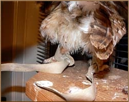 12.3 Putting the jesses on Easier said than done at first, though the owl gets used to it after a while. Basically, place the head end of a jesse around a leg just above the foot (not higher), thread the pointed tail through the hole in the head and pull tight around the leg until the twisted part is sitting neatly in the hole. Repeat with the other leg. The jesses shouldn't actually be tight on the owl, but if made correctly they won't slip over the feet and will pull tight like a noose when the owl jumps off you. | ||||||||||||||||||||||||||