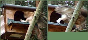 Some old pics left over from this page showing how adult owls use a ledge. Left: aircraft carrier stop against the base of the door; right: kicking off. This is a female with young. The father (night photo) sometimes stands on the ledge to survey the scene when he arrives with prey (thumbnail only). | ||||||||||||||||||||